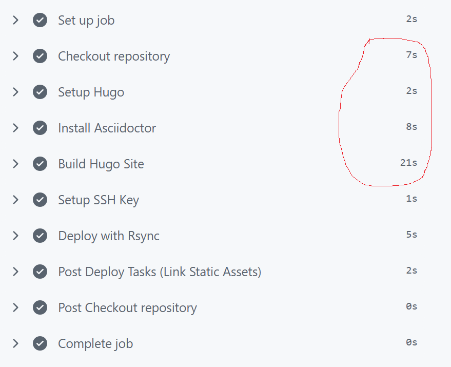 第二个活动也比较有趣。一不做二不休,既然我现在要消费降级,我就得将github的actions用尽才行。所以,我就另外叫gemini生成了一个action脚本,在github上运行hugo的大量编译,然后再下发内容到跨文翻译。这个脚本本身没有什么意思,我就不在这里展示代码了。下图可以看到,重要的计算都挪到github了: